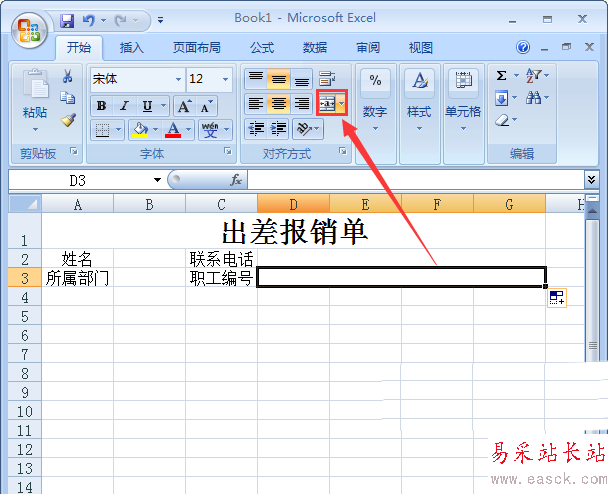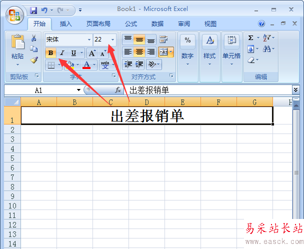 2、在合并的單元中輸入【出差報銷單】的文字,設(shè)置字號為【22號】,【加粗】。