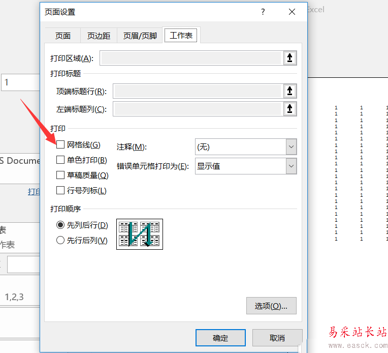 6、在工作簿里可以找到網格線,勾中網格線前面的方框,然后確定,就可以在預覽看到網格線了,也能打出網格線出啦了。