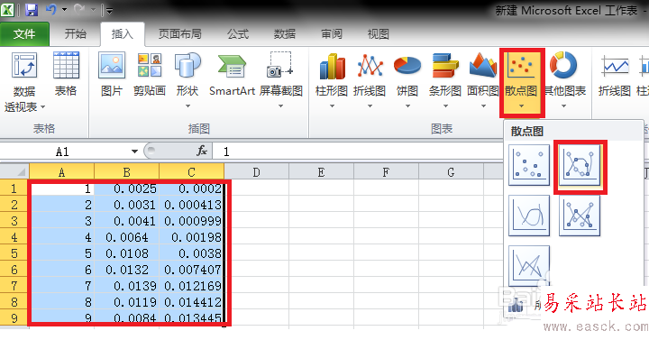 1、隨便編兩組數據(方便描述操作步驟),用Excel作圖,選中數據點擊插入,選擇散點圖中的第二個