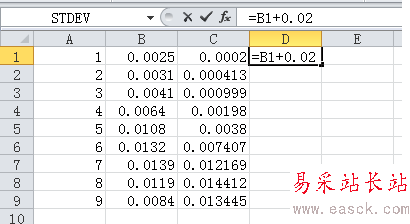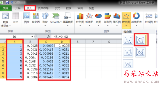 4、在D1列中輸入“=B1+0.006”,單擊enter鍵,將此公式應用到整個D列,具體辦法是將鼠標停在D1的右下角,等鼠標變為一個十字架時,向下拖動鼠標填充即可。然后以A、C、D列作為源數據,插入散點圖,選擇第二個散點圖,點擊確定即可,從圖中可以看出系列1平移到系列2上了