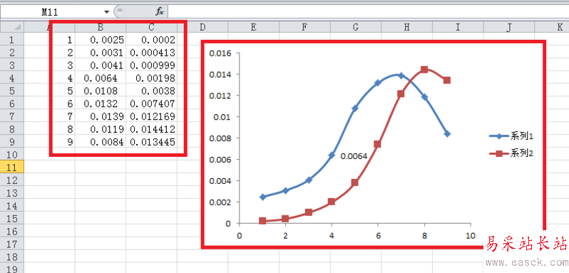 3、有時會有的繪圖要求是要這兩張圖上下排布,所以我們就需要將其中一條曲線向上平移,以系列1為例。其實方法很簡單,為了將系列1曲線向上平移,且保證整個曲線的趨勢不變,只要將系列1對應的Y值整體加上一個常數即可