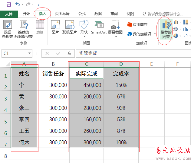 2、首先,我們需要選中“姓名、實際完成、完成率”三列的數據。同時按住Ctrl鍵,按鼠標左鍵拖選這三個區域的數據。選中這三列的數據后,選擇EXCEL功能選項 插入-推薦的圖表。