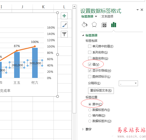 5、柱形的數據標簽添加有點不同,同樣是選中柱形,按鼠標右鍵,在彈出的快捷菜單里選擇設置數據標簽格式,然后在EXCEL工作表最右邊會出現設置數據標簽格式的對話框。如圖,將 值 前面的復選框勾選上,標簽位置選擇居中。