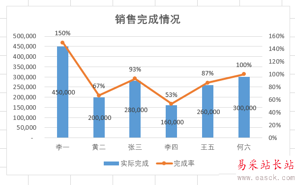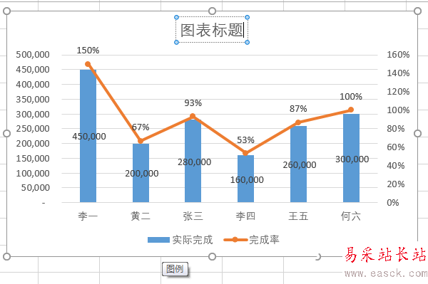 6、接著將圖表標題更改下,直接選中標題,將鼠標光標移到標題框中,刪掉原來的標題,改為我們需要的標題“銷售完成情況”就可以了。我們需要的雙坐標軸圖表就做好啦。