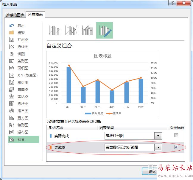 3、彈出插入圖表對話框,選擇 所有圖表-組合 。如圖,實際完成 圖表類型我們選擇 簇狀柱形圖,完成率 選擇 帶數據標記的拆線圖;并將完成率 次坐標軸 對應的復選框 勾選上。點擊 確定 按鈕。