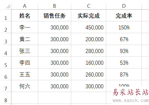 1、如圖,為我們的原始數據,我們需要將實際完成和完成率兩列的數據用雙坐標軸圖表來展示。