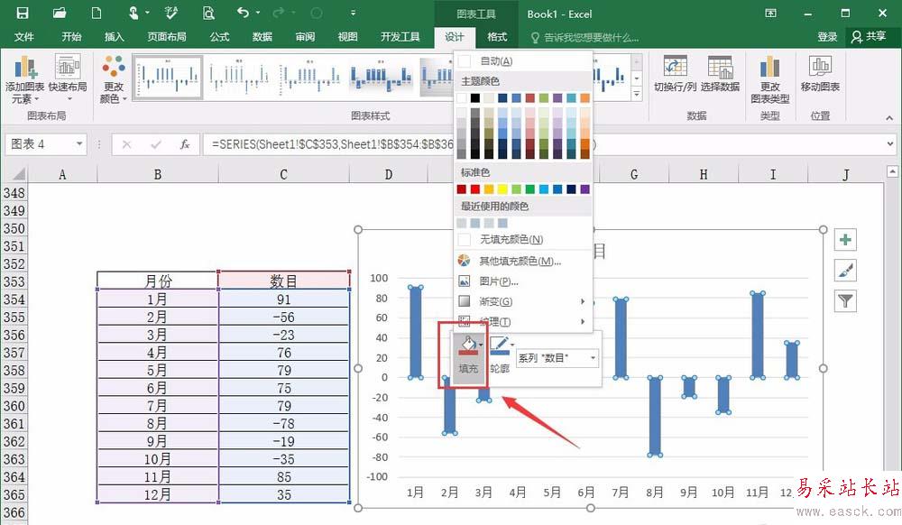 4、接下來,就是一個圖表的美化工作了,如果是想表現(xiàn)出盈虧對比,那么就可以使用紅色與綠色進(jìn)行搭配,比如如果是正數(shù),那么就填充為綠色,負(fù)數(shù)就填充紅色。
