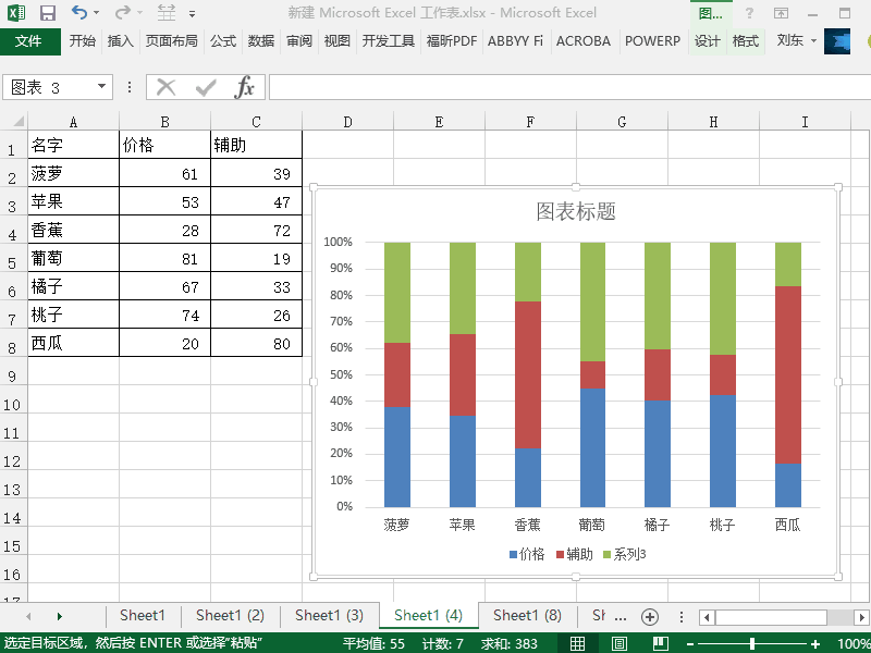 1、首先我們選中表中的數據,然后點擊插入選項卡,插入一個百分比堆積柱狀圖。