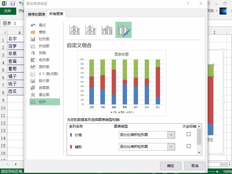 4、我們選擇最后一行數據,改為帶數據標記的折線。勾選次要坐標軸,點擊確定。