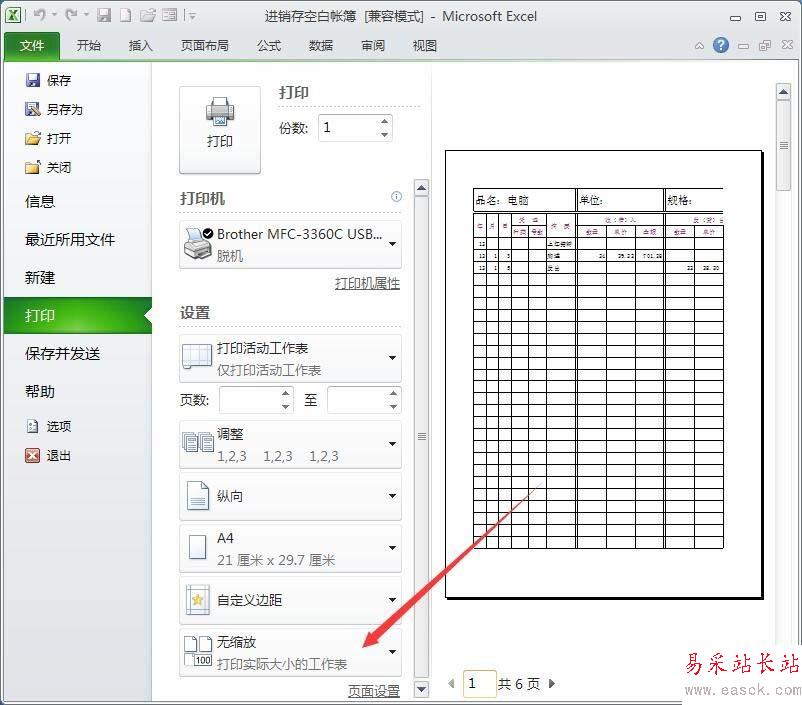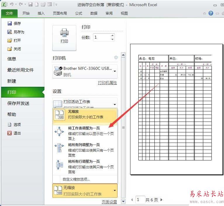 2、出現打印設置界面,在底部的“無縮放”處點擊,在向上彈出的菜單項中點擊“將工作表調整為一頁”。