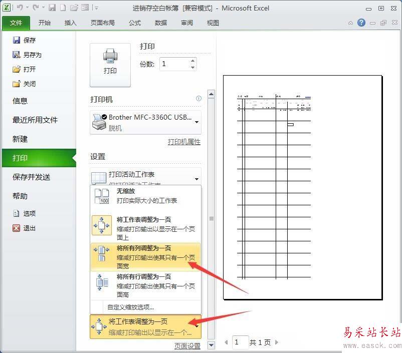 3、在右側的預覽界面立刻顯示出調整后的樣子。如果只是列寬想縮成一頁,繼續點擊底部按鈕,在彈出項中選擇“將所有列調整為一頁”。