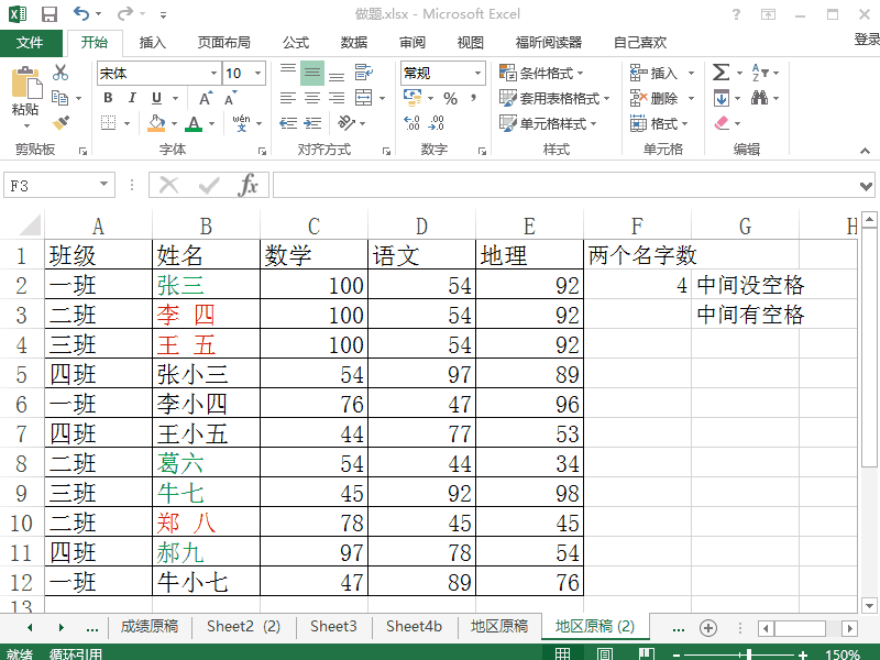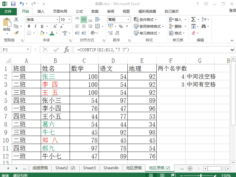 1、統計姓名無空格,選擇一個空白單元格輸入公式=COUNTIF(B2:B12,"??")。公式的意思是,統計B2:B12區域,兩個文本字段的個數(??),為了驗證統計正確性,已經事先進行了顏色標記。