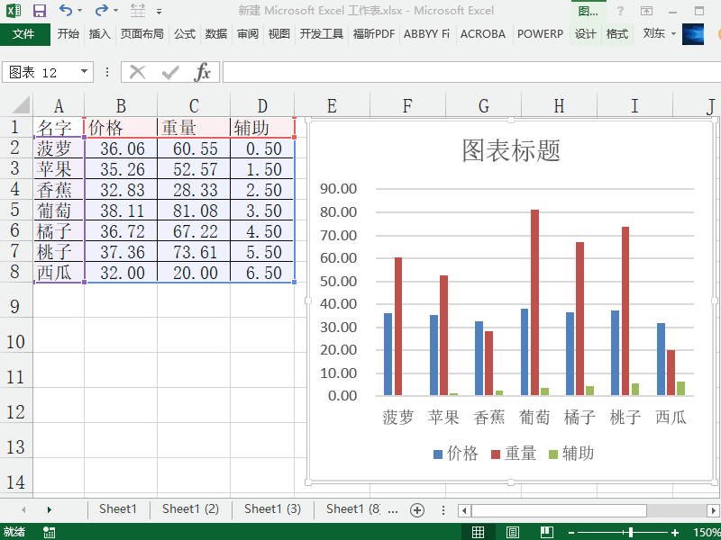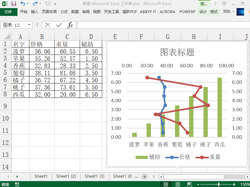 3、接著我們選擇藍(lán)色和紅色的數(shù)據(jù),把y軸設(shè)置為輔助列。