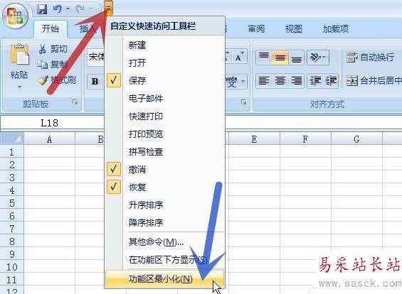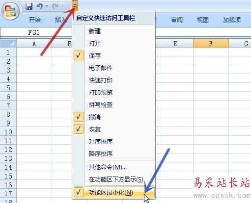 2、有兩個途徑可以實現功能菜單的隱藏,第一個是點擊頂部的“自定義快速訪問工具欄”的下拉按鈕(圖中紅色箭頭所指),并點擊“功能區最小化”(圖中藍色箭頭所指)