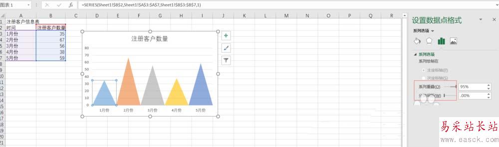 5、然后把之前復制的幾個三角形的圖形刪掉,再選中柱形圖,單擊右鍵,選中設置數據系列格式,調整系列重疊與分類間距,慢慢調整預覽,知道你喜歡的大小即可。