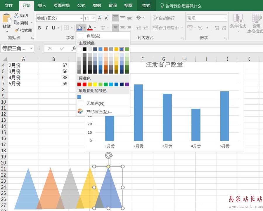 2、然后在插入--形狀--三角形,形狀填充中透明度設為百分之40,形狀輪廓設為無輪廓,然后多復制幾個