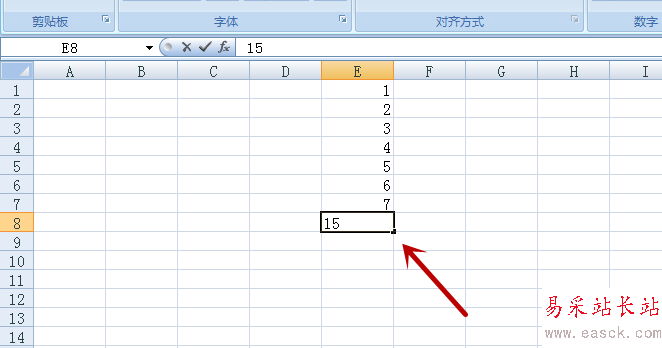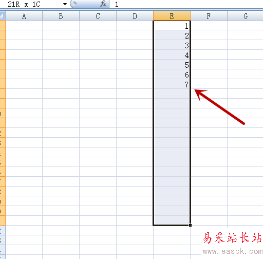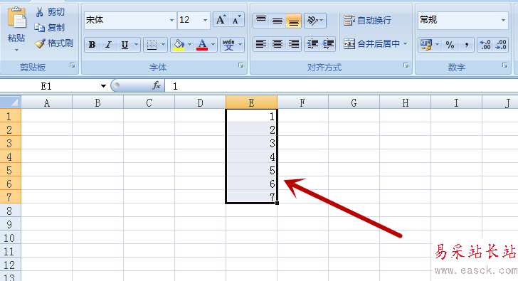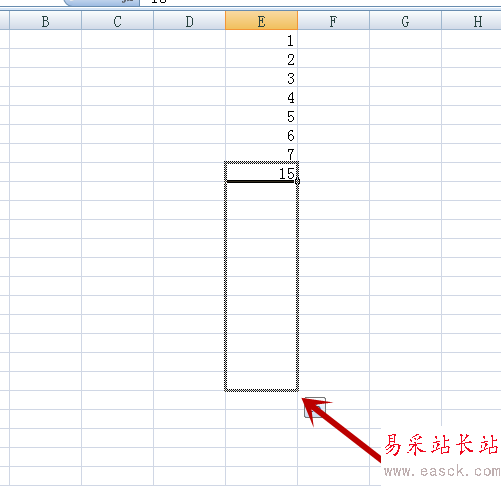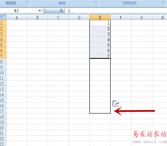 6、之后我們將輸入數字的單元格選中,鼠標放在黑框的右下角,出現十字后向下拉,注意這個時候不要按Ctrl按鍵,如圖所示。