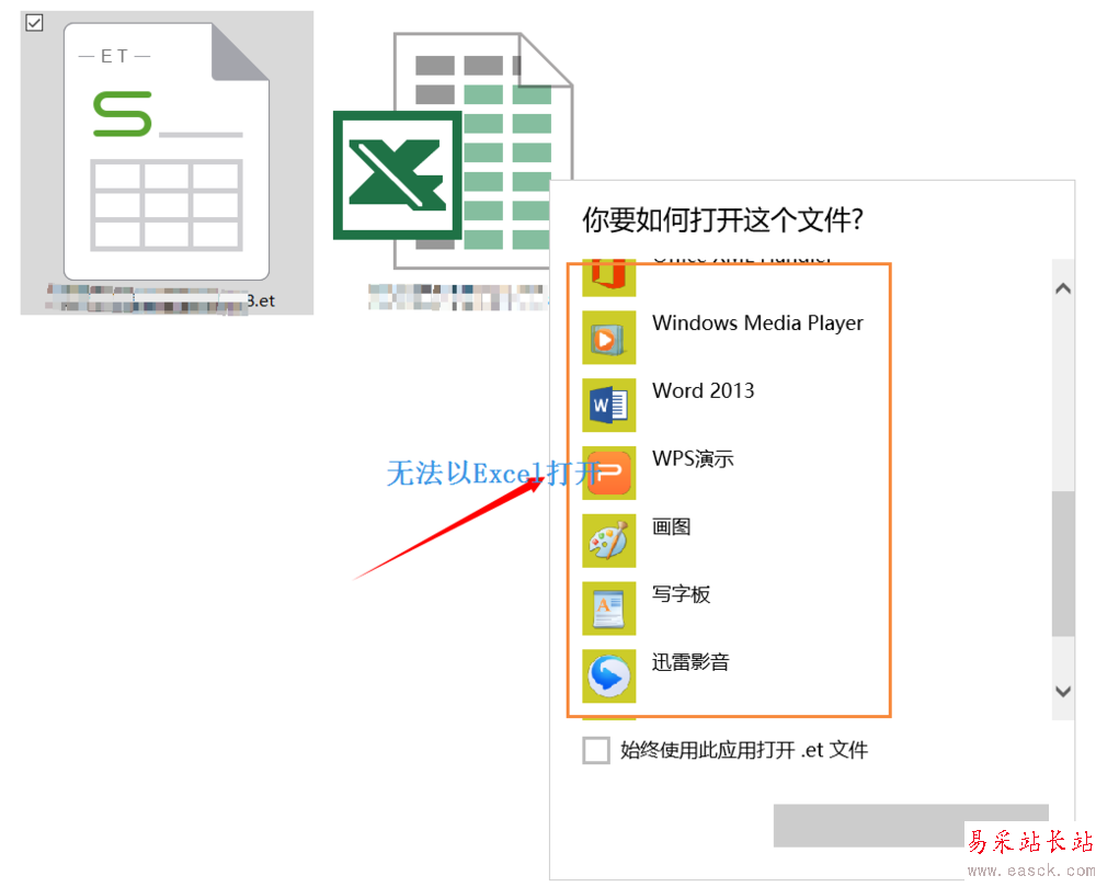 1、如下圖,我們可以看到這是一個后綴名為.et的文件,系統默認是WPS表格的形式呈現...如果我們點擊鼠標右鍵選擇其他打開方式卻發現找不到Excel,即使我們的電腦里安裝有Excel軟件;
