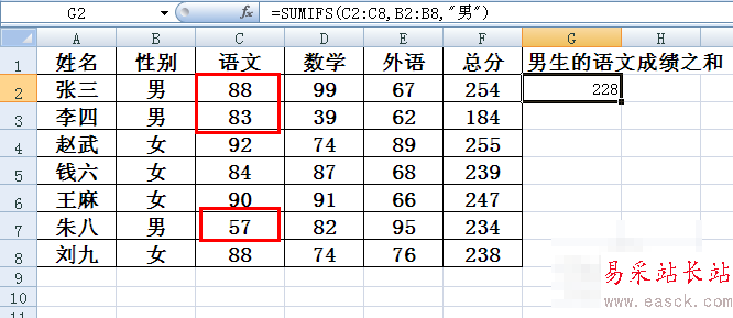3、得到結果是228,我們看圖中男生成績得分之和與公式得到的結果一致。