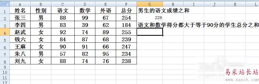 5、在G4單元格輸入公式=SUMIFS(F2:F8,C2:C8,">=90",D2:D8,">=90")