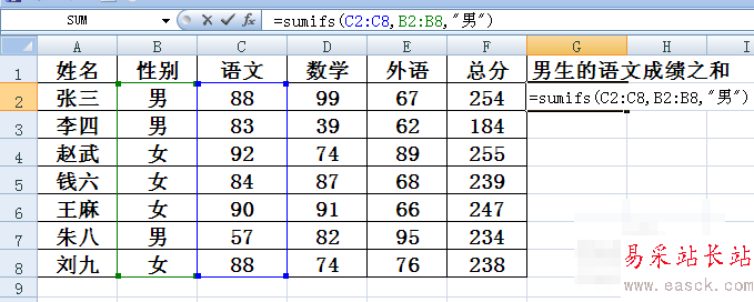 2、在G2單元格輸入公式=SUMIFS(C2:C8,B2:B8,"男")