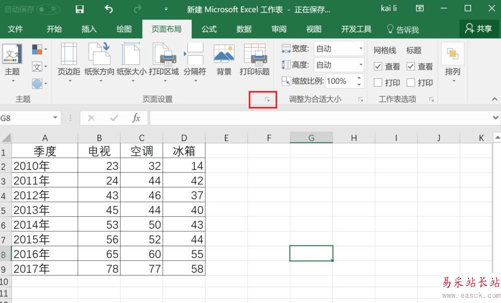 2、點(diǎn)擊下圖紅框中的小箭頭,打開頁面設(shè)置對話框。