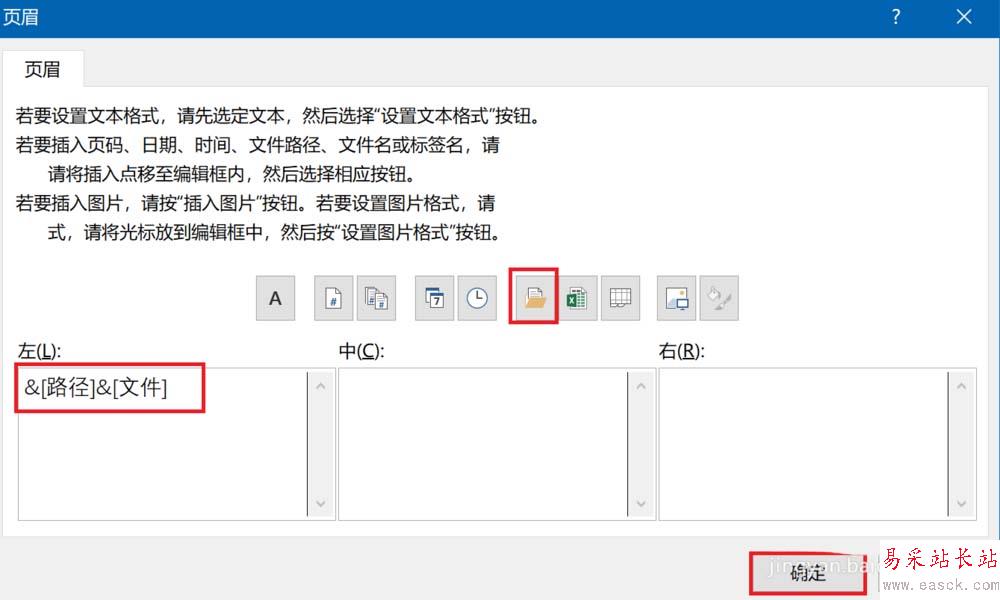 4、然后彈出下圖中的界面,點(diǎn)擊右側(cè)上方紅框中的圖表,就可以插入文件路徑了,具體文件路徑顯示在頁眉的哪個位置,需要自己確定,設(shè)置好后點(diǎn)擊確定。
