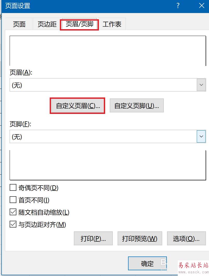 3、在彈出的對話框中,點(diǎn)擊頁眉頁腳,然后選擇自定義 頁眉進(jìn)行設(shè)置。