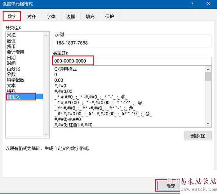 4、在彈出的設置窗口中,選擇數字,然后點擊自定義,在類型中輸入“000-0000-0000”