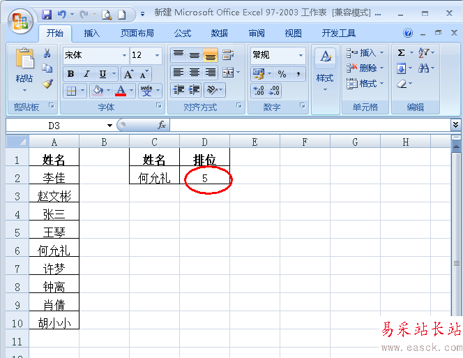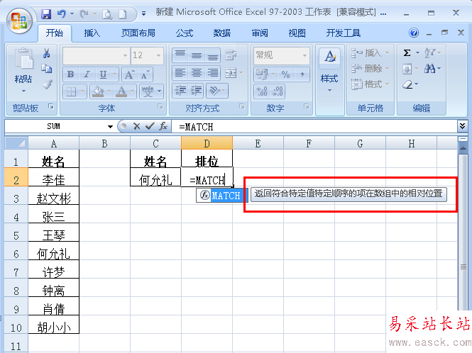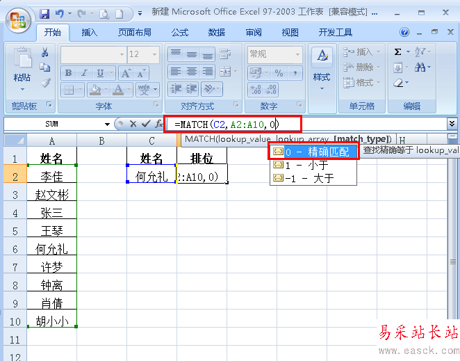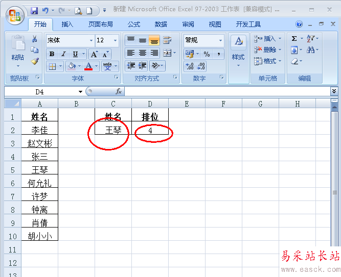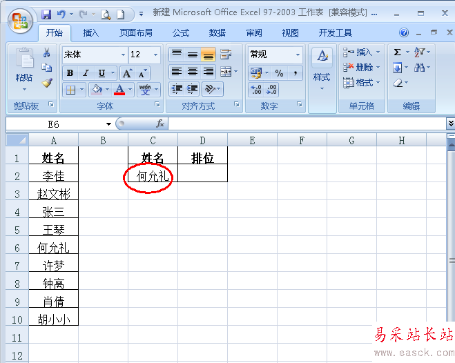 2、下面需要查找C2單元格中的名字在列表中的排位(如圖);