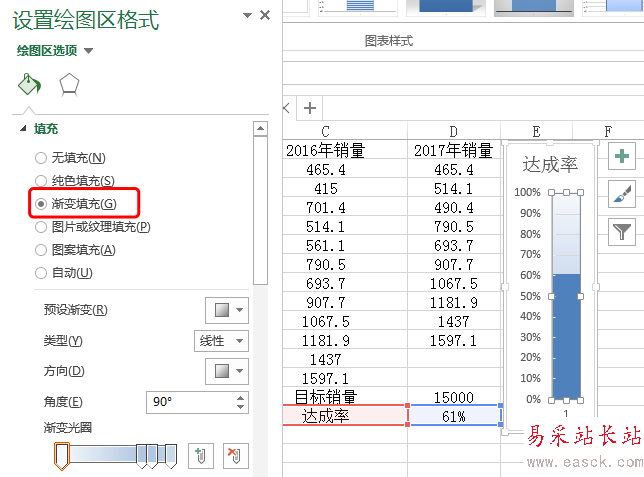 6、雙擊數據柱上方的區域,在彈出的[設置繪圖區格式]中,將填充改為[漸變填充]。