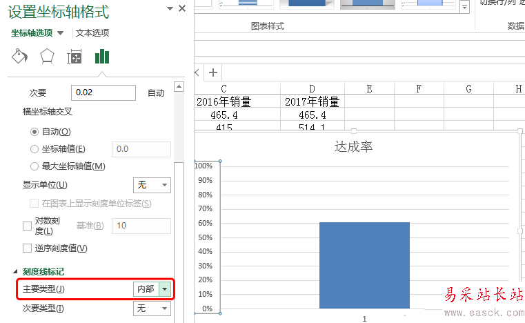3、拖動滾動條,在[刻度線標記]中,主要類型設置為[內部]。
