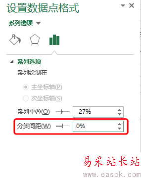4、兩次單擊后,再雙擊數據柱,在彈出的[設置數據點格式]菜單中,將[分類間距]設置[0%]。
