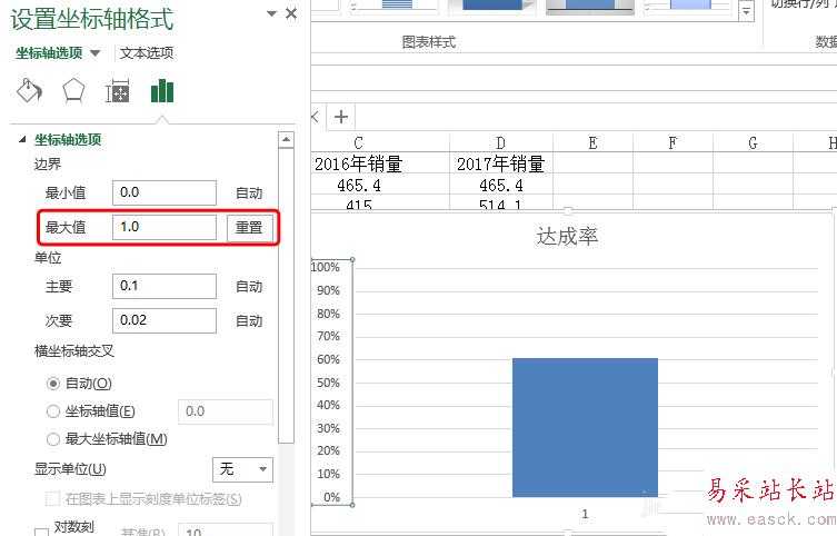 2、雙擊垂直坐標軸,在彈出的[設置坐標軸格式]中,將邊界的最大值設置為[1.0]。