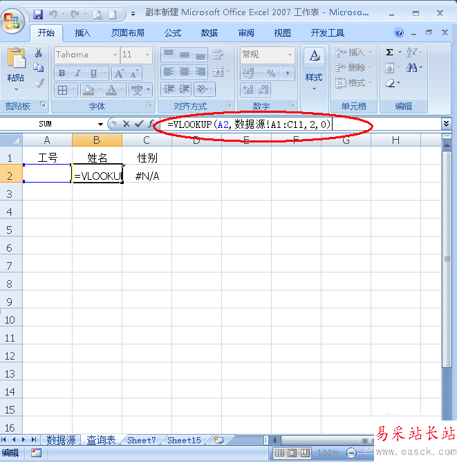 3、在姓名下面的單元格輸入公式“=VLOOKUP(A2,數(shù)據(jù)源!A1:C11,2,0)”;其中’A2‘表示用來查詢的值,這里為工號,’數(shù)據(jù)源!A1:C11‘表示數(shù)據(jù)源中的數(shù)據(jù)區(qū)域,’2‘表示姓名所在的列,而’0‘表示精確匹配(如圖);