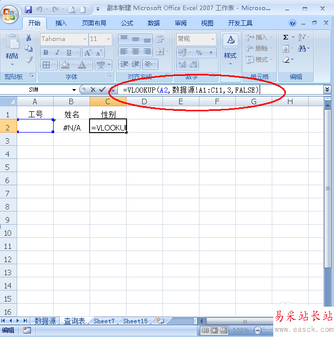 4、同樣的,在性別下方的單元格輸入公式“=VLOOKUP(A2,數(shù)據(jù)源!A1:C11,3,FALSE)”(如圖);