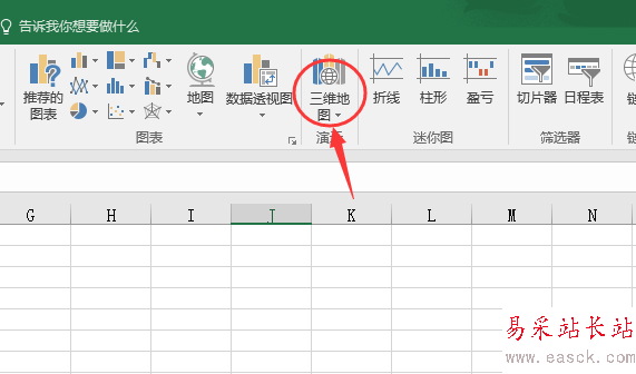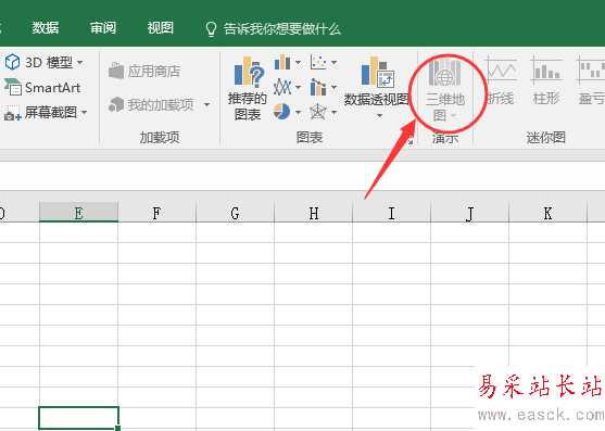 2、在Excel 2016中找到“三維地圖”所在的位置以后,可以看到是灰色的,這也是很多網(wǎng)友遇到的問題,那么該怎么辦呢?