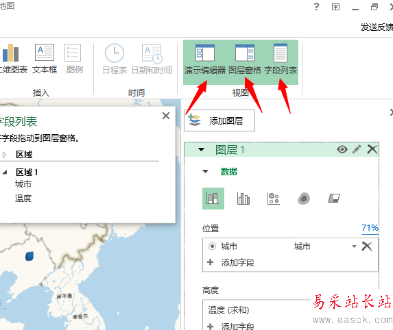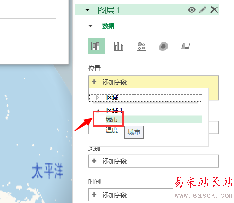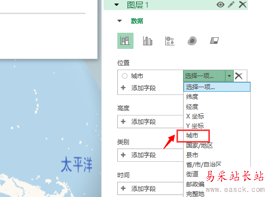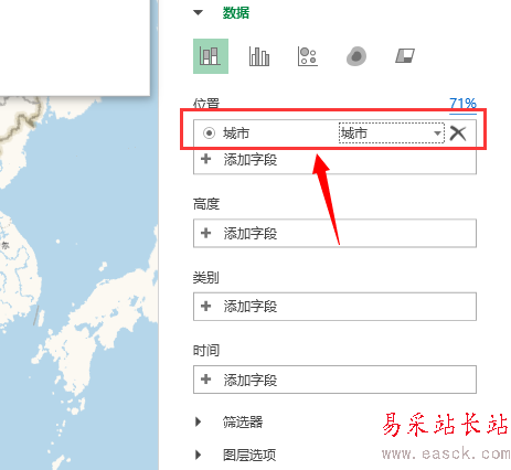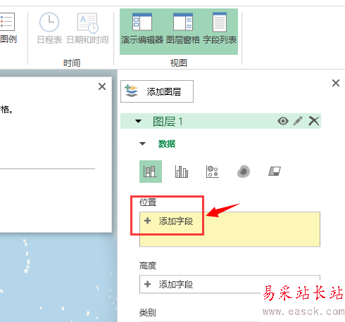 4、進入三維地圖的圖層窗格,在位置這個地方,點擊開始添加字段,這個就是三維地圖對應的城市位置。