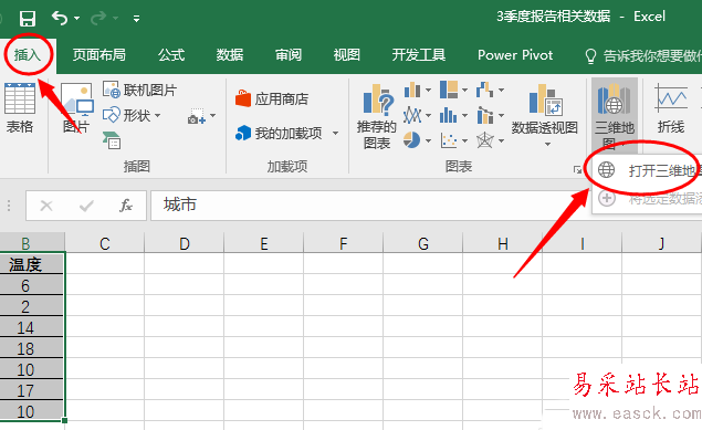 2、之后,在上方的功能區中選擇“插入”選項卡,在演示組中選擇“打開三維地圖”。