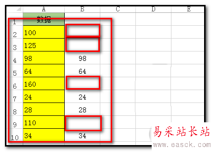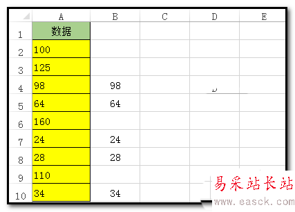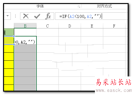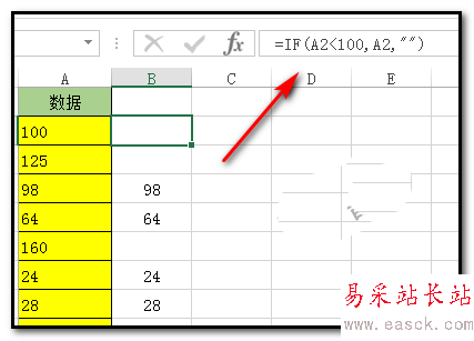 2、選中B2:B10;再在編輯欄中輸入公式:=IF(A2<100,A2,""),公式的意思是,若A2小于100的,就顯示A2的數字,否則顯示為空。按下CTRL+回車鍵,強制自動填充公式,得出結果。