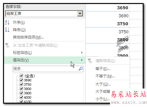 5、在選擇字段這里,選擇:應發工資,鼠標再點:值篩選,右側彈出菜單