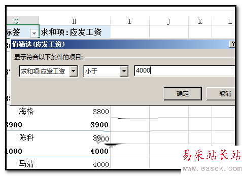 7、點確定后,即篩選出小于4000的數據了。如圖中的效果。