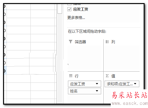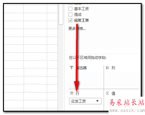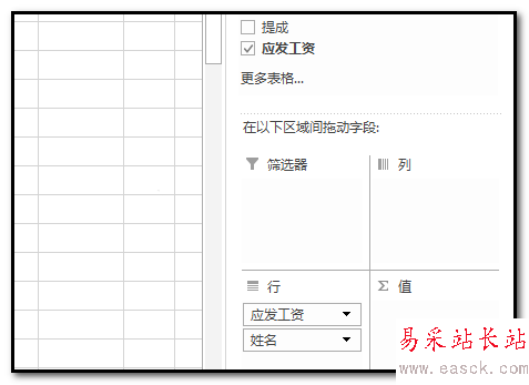 3、把“姓名”也拖到“行”這里。再把“應發工資”拖到“行”這里。
