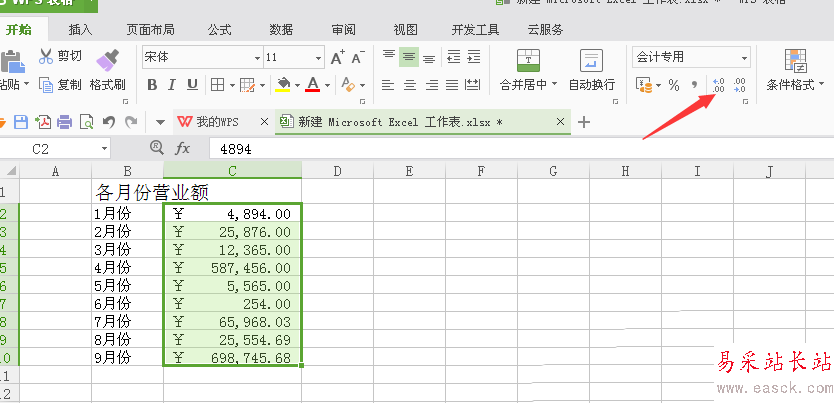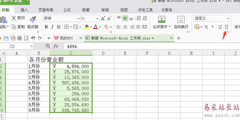 4、如果想設置小數(shù)點位數(shù),則先選中要設置的單元格,想增加小數(shù)位數(shù)時,點擊如圖所示的選項。