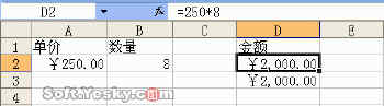 下圖所示的工作表中的A2和B2單元格分別存放著某種商品的“單價”和“數量”數值,為了計算“金額”數值,可以在D2單元格中輸入公式“=250*8”(圖 1),通過后面的學習我們會知道,像這樣使用具體數值建立的公式,適應性很差,因此用得也很少。