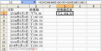 下圖所示的工作表中的B2和B11單元格分別存放10天的銷售額,為了計算這些天的銷售額總和,可以在D2單元格中輸入公式“=B2+B3+B4+B5+B6+B7+B8+B9+B10+B11”(圖 3),這個公式和數學中的求和公式沒什么兩樣,不過由于需要求和的項目太多,所以公式看起來比較長。