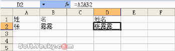 下圖所示的工作表中的A2和B2單元格分別存放著“姓”和“名”字符,為了得出“姓名”字符串,可以在D2單元格中輸入公式“=A2&B2”(圖 5),其中“&”是一個運算符號,我們稱它為連接符號,它的功能為把兩個文本字符或文本字符串連接起來。
