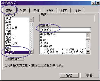 2.點擊“數字”標簽,選中“分類”下面的“自定義”選項,然后在“類型”下面的文本框中輸入"zjsx"#(注意:必須在英文狀態下輸入),點擊[確定]按鈕即可。如圖2所示。