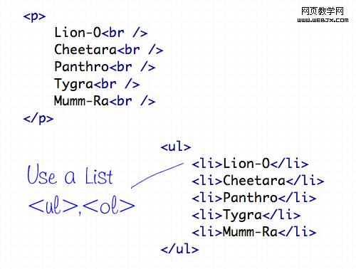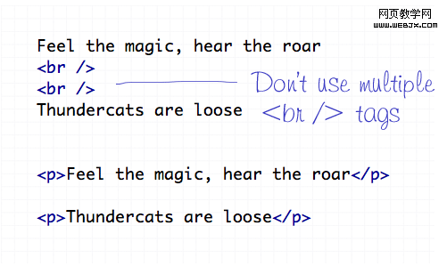 <br />換行標記只應該用于插入是在第一個文本流換行符敲到一個新行一個特別字了。它不應該被用來制造元素之間的差距,而是分裂成不同的段落,或調整的幅度css樣式的文本。