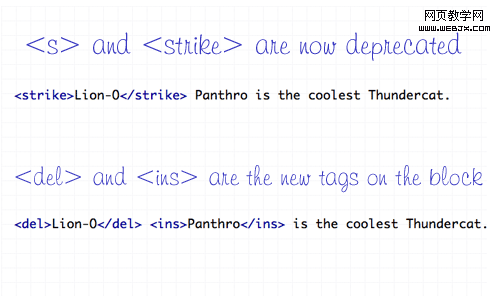在昔日,<s>和<strike>允許用來定義網站文字。不過,現在他們被定義為不推薦使用的標簽,當他們任然可以有效果.現在用新的標記集- <del>和<ins>。來替換<s><strike>